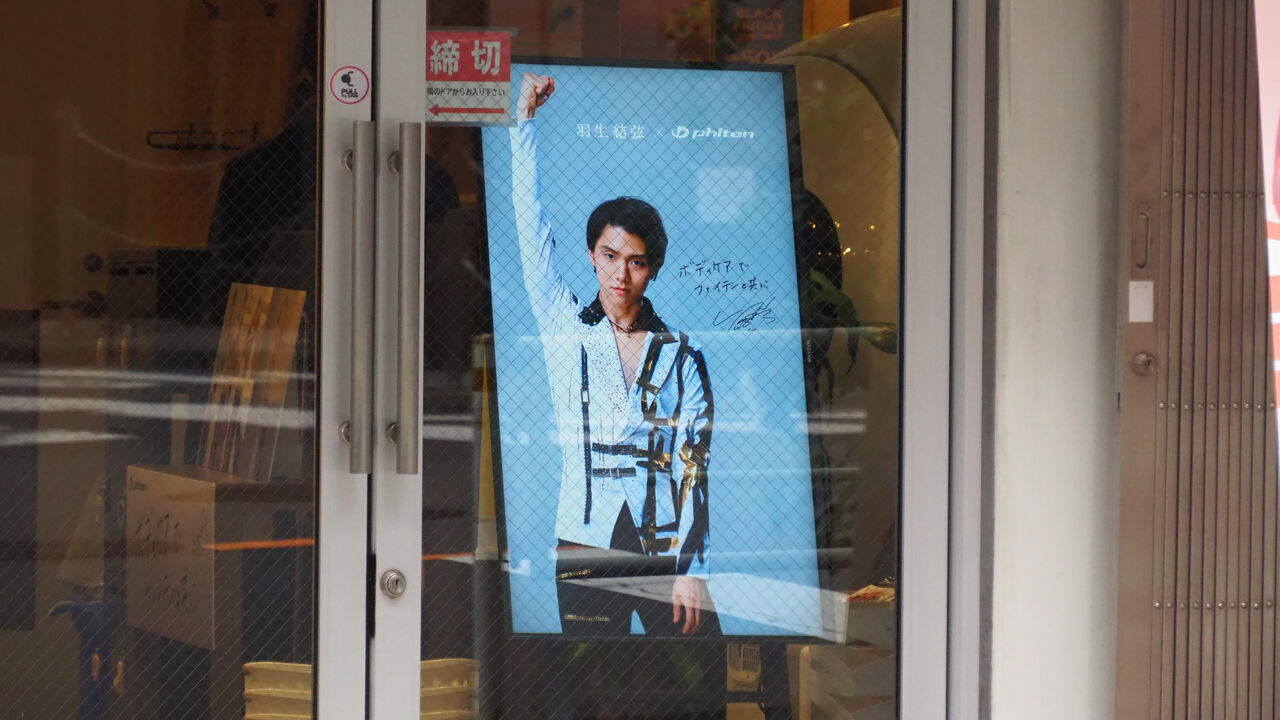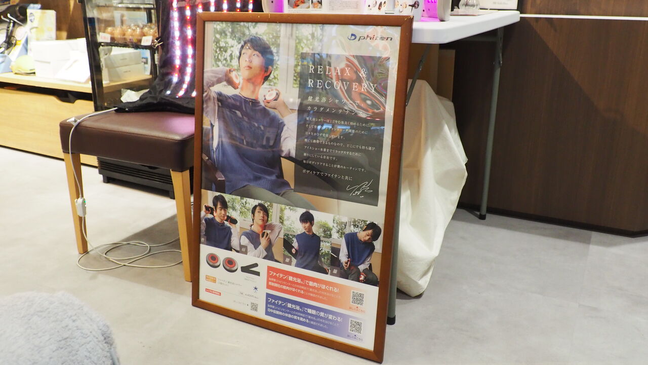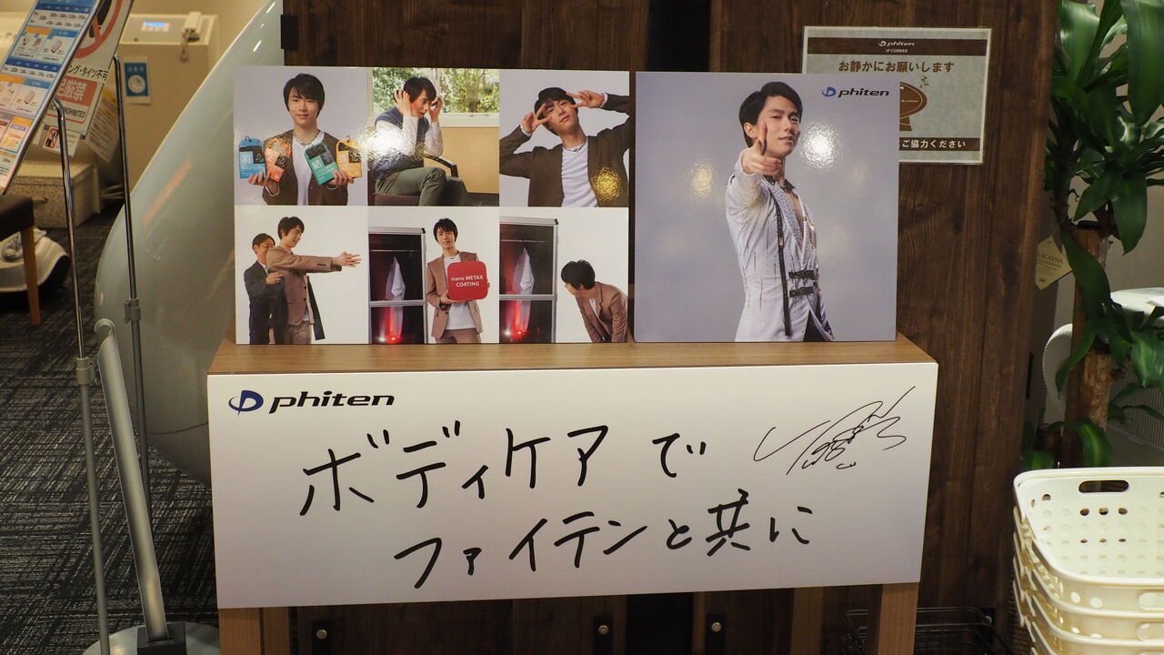 そんななか、長年羽生氏と伴走し、ボディケアのサポートをしてくれているファイテンさんでも「誰がやらなくてもウチもやります」の勢いで賑わいの催しを開催してくれるとのこと。羽生氏がメンテナンスに入る前に撮影した新たな映像・写真パネルを展示し、さらにその展示の模様を撮影してSNSに投稿するとオリジナルステッカーをくれるというひと足早いクリスマスプレゼントのような企画です。これは行くしかない!と僕も奮ってファイテンショップへと向かいます。