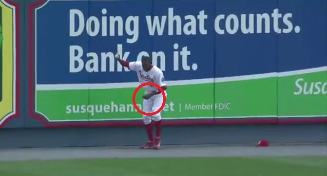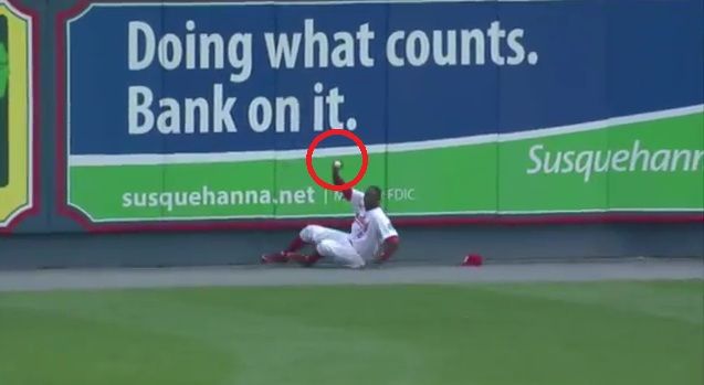 まるで間違い探しのように、次々におかしな点が露わになるプレー。まずおかしいのが、どう見ても捕っていないこと。スローでリプレーが流れたときに、グラブの土手に当たってチラリとこぼれる白い軌跡。普通に落としている、ていうかホームランだろという白い線。一体、これが何故最終的にあのスーパープレーになったのか。ビデオ判定の導入が早急に求められそうです。