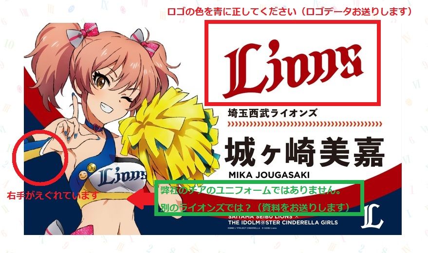 もし、そういった自罰的な意識というか「検索社会に不適合な名前で申し訳ない」という自覚があれば、アイドルマスター様がイラストのラフか彩色バージョンを監修出ししてきたときに、「あぁ案の定」と気づけたはずです。基本線は「事前にコッチから資料を渡す」であるのは当然として、最悪でもチェック時には気づくことができた。それができなかったのは西武側の問題です。三菱ライオンズとはわからなかったとしても、「ライオンズ違いかも?」という意識を常に持っていれば違うことはわかるはずです。