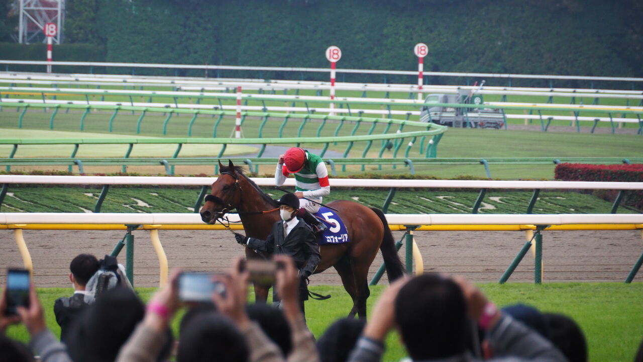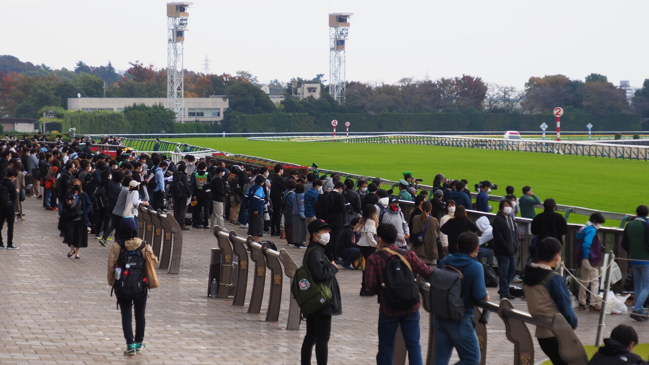 ただ、3頭のなかでも人気はコントレイルが抜けているでしょうか。ハロウィンの仮装さながらに、コントレイルの勝負服と同じ柄の服を着込んだ人がチラホラといます。パドックでもコントレイルが通過するあたりからパシャパシャパシャというシャッター音が聞こえます。僕もこの目で見るのは初めてとなる昨年の三冠馬をしっかりと目に焼きつけます。青鹿毛の美しい馬体。やや細身でしなやかな身体。ゆったりした歩様。見たところで良し悪しはわかりませんが、ほほぉと思います。