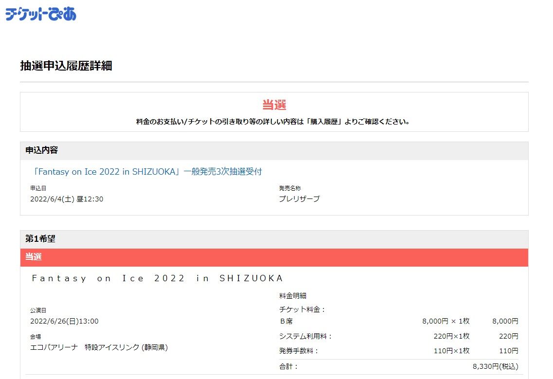 しかし、この金曜日、通知は夜中も朝も昼もまったく来ませんでした。そして普段のマウントが逆の方向で働いて自分を苦しめていました。決済の通知が来ないということは、この日が当落発表である「ファンタジー・オン・アイス2022」の静岡公演3次発売で落選したと考えざるを得ないということ。落選か、落選なのか。「アリーナのほうとは言え、エコパを埋め尽くしたか…」「痛恨の出遅れ…」「いっそ東京ドームとかでやるべき…」などと改めてこの公演の人気ぶりに悲鳴を上げていたのです(←チケットが取れないくらい人気なのは嬉しい/自分が取れさえすれば)。