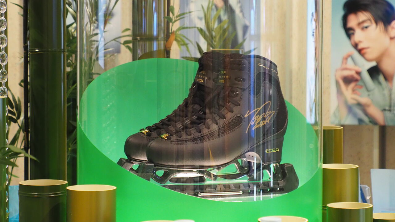 心も身体も温まったところで、つづいて向かったのはメゾンコーセー銀座さん。本日も1階のスタッフさんに元気にご挨拶して、実家にでも来たくらいのこなれ感で2階の展示フロアへと向かいます。そこに広がるは緑の若竹空間。若竹の君のフォトパネルの展示もさることながら、リアルな竹林が築かれているのは壮観です。その竹林繁る台座の中央には、まるで竹を切ったらなかからスケート靴が出てきたかのような感じで羽生氏の靴が展示されているではありませんか。