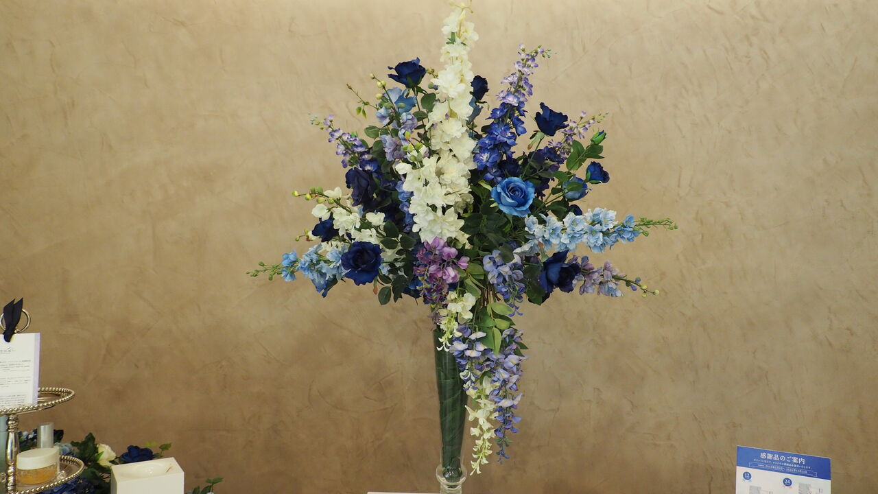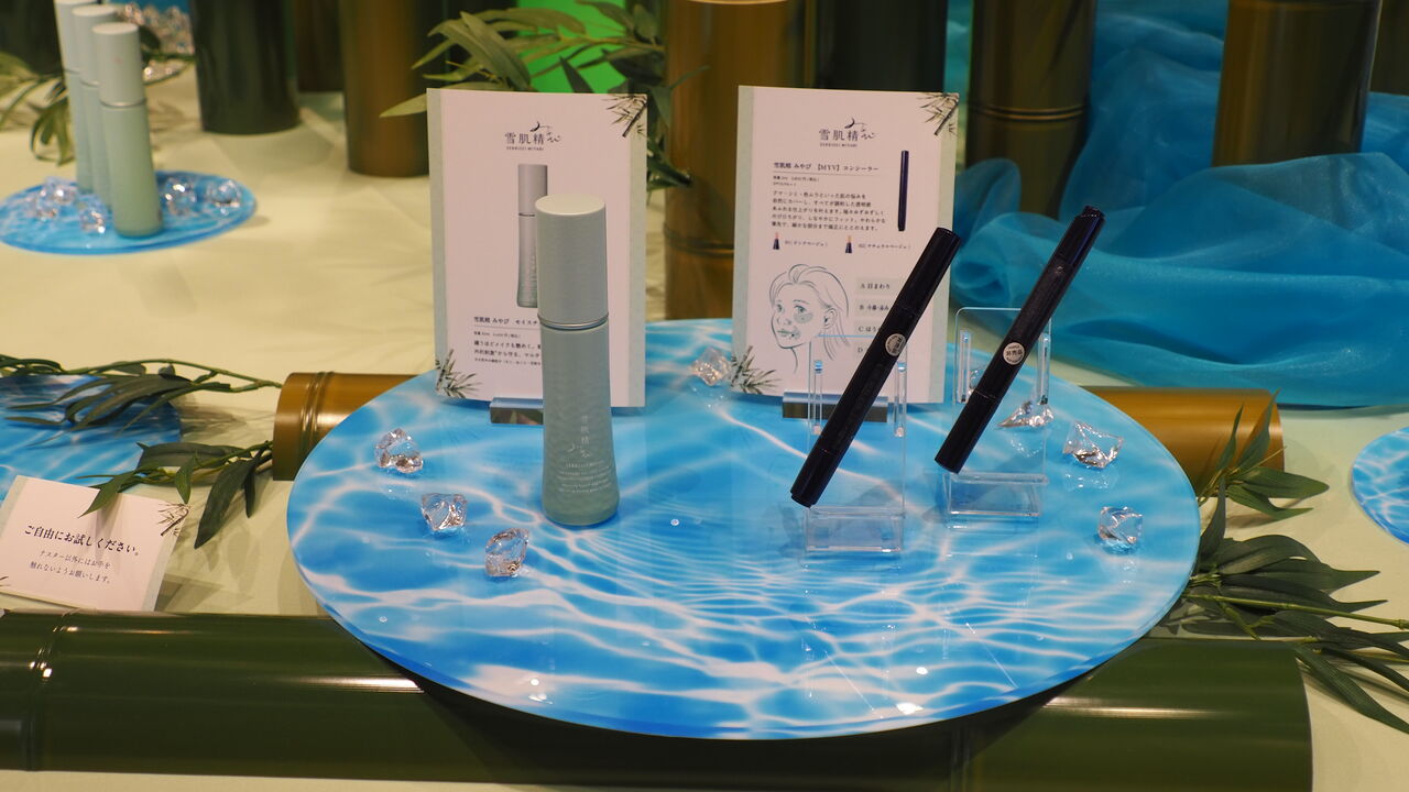 台座の上には竹林にくわえてキラキラした飾りなども据えられており、ちょっとした天の川のようです。そのなかにモイスチュアプロテクトセラムやコンシーラーが置かれており、ご自由にお試しくださいとのこと。お試しについては自重してしまいましたが、「やっぱり竹っぽい」などと思いながらひとしきり拝見しました。別の台座にもさまざまなテスターとみやびやかなお花が設置されており、いつにも増して優雅で心安らぐ空間に大変癒されます。