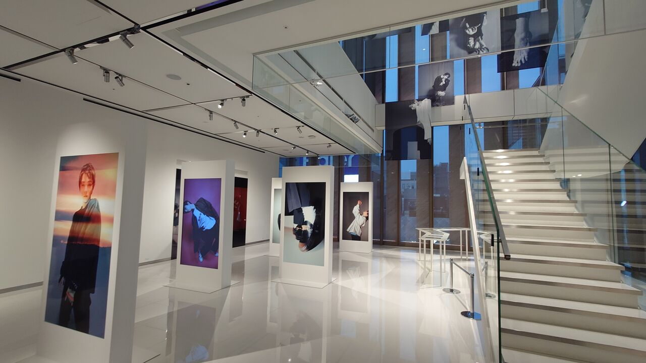 予約の時間にお店にうかがうと、この日もギャラリーは盛況です。アジアのインフルエンサー風の人は撮影エリアにある写真と並んで素敵な決めポーズで撮影しています。僕も改めて展示写真を拝見しつつ、会場の全体図の抑えがもう少し欲しかったという思いもあり、スマホの広角カメラで会場の様子などをおさめていきます。
