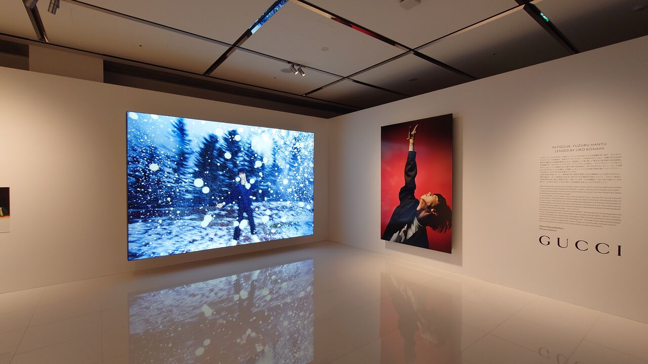 小雨降る銀座の街は、少しだけ普段より人通りも少なく感じます。それでもたくさんの通行客と歩行者天国は魅力的なのか、次々に都知事選の候補者が演説をしにやって来ている模様。その盛り上がりを横目に見つつ、僕は羽生氏巡りへと繰り出します。まずはグッチ銀座さんのギャラリーで行なわれている「In Focus: Yuzuru Hanyu Lensed by Jiro Konami」へ。以前も拝見している写真展ですが、やはり銀座に来る機会には欠かさず訪れておきたい羽生氏関連ホットスポットです。