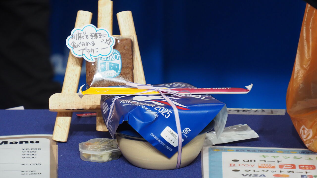 景気のいいおもてなしを受けたあとは、もぐもぐ横丁を冷やかしにまいります。アリーナ併設の体育館に多くの人が詰めかけ、この日のために持ち込まれたグルメに舌鼓を打ったり、記念グッズを買い求めたりしている様子。氷がなくても何とかカーリングをしたいという熱意に突き動かされて生まれた「滑る床」や「テーブルの上でカーリングを遊ぶゲーム」の展示では、親子連れなどもカーリング体験に勤しんでいました(←それはカーリングではない気もするが)。さらに、特設のフォトスポットでは実際のストーンやブラシを携えて記念撮影ができるようになっており、僕もスキップ気取りでブラシで指示出しなどしながら記念撮影をさせていただきました。