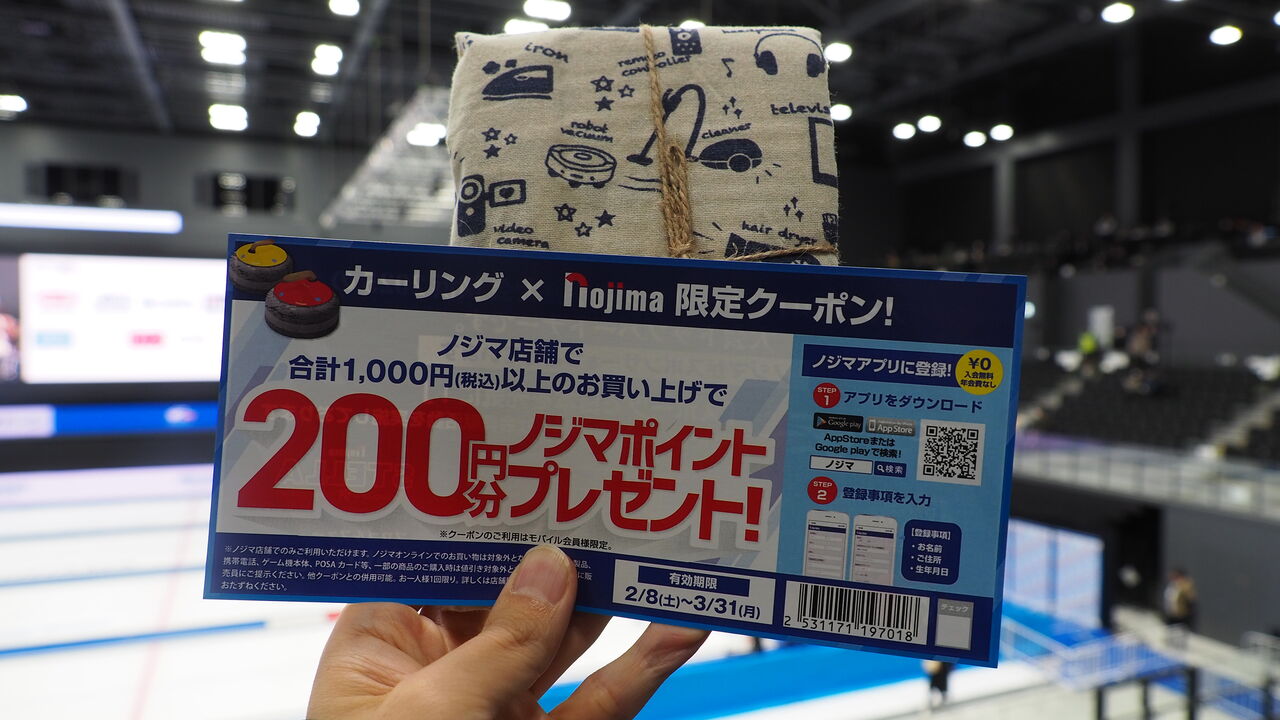 早速散策から始めていきますと、入場口付近ではいろいろな配り物が用意されています。学研さんが「地球の歩き方」テイストで特別編集した「カーリングの歩き方」なる冊子がいくらでもどうぞの雰囲気で自由配布されていたり、大会スポンサーのアマノさんは応援用のスティックバルーンを配ってくれています。同じく大会スポンサーのノジマさんは、抽選でプレゼントキャンペーンを実施しており、買い物をしたときにポイントがもらえるクーポン券などを配布してくれています。うむ、最近はステッカーをいただく機会が多いなか、ステッカー以外のものをいただくとグッと気分も上がってまいります。ぜひいただいていきましょう。