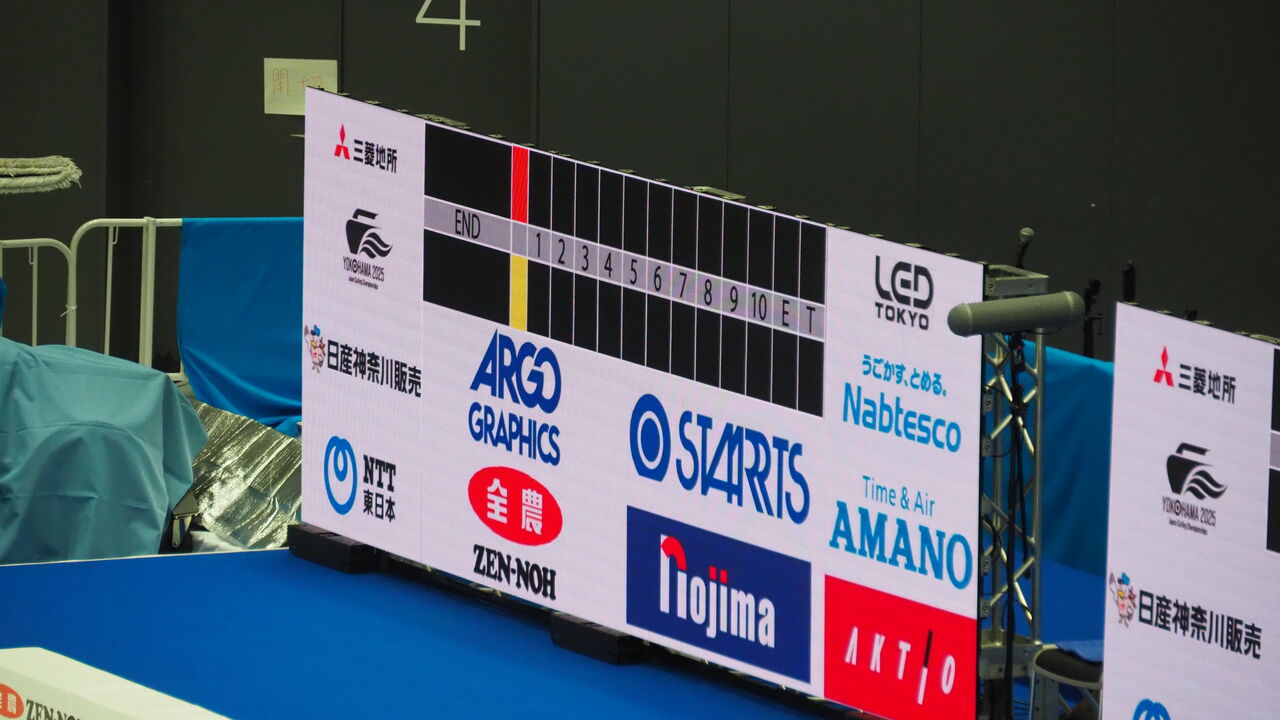 なるほど、このあたりは「首都圏開催とは言っても、カーリング見に来るぐらいの人だからカーリング好きなんだろう」という割り切りを感じさせます。ちょっと気を回し始めると「場内解説くらいしたほうがいいかな?」とか思ってしまいがちですが、せっかくの現地ですからやはり選手たちのコールを聞きたいもの。「7…7.5!」「8あるかもー!」「ヤァーップ!」などのデリバリー中の掛け声から、作戦を検討しているときの相談話までが結構クリアに聞こえてくるのは現地ならではの楽しみだなと思いました。シートまでの距離も近く、臨場感があっていい感じです。