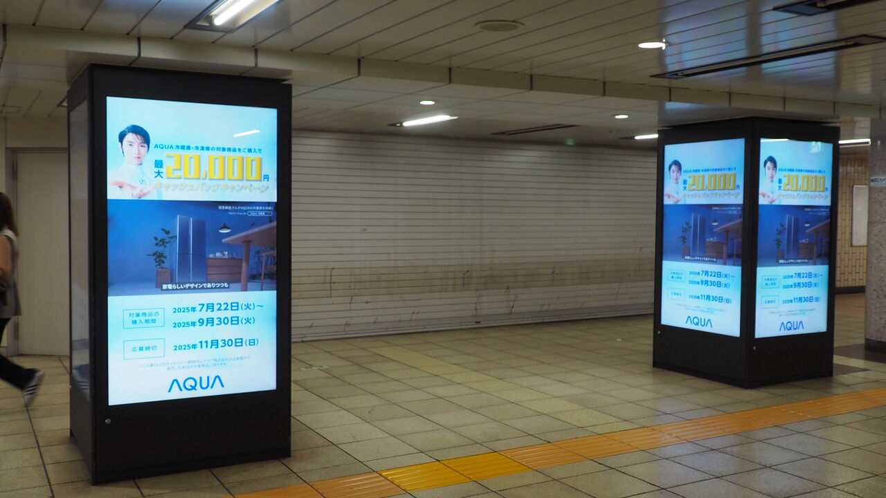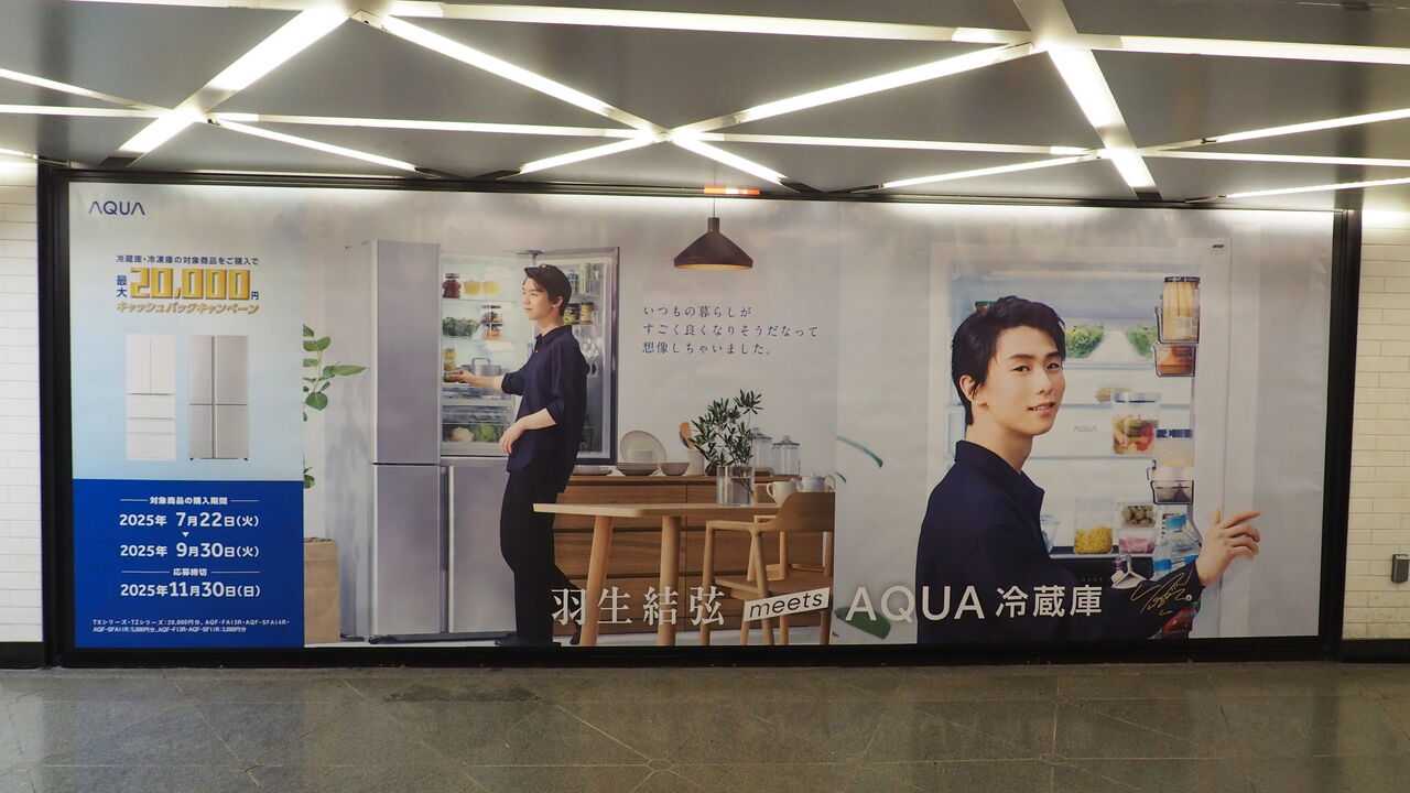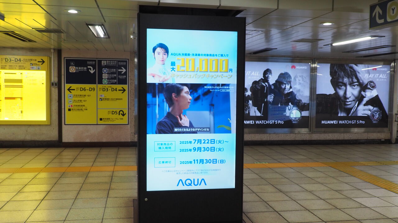 普通に電車で来るなら東京メトロ有楽町線有楽町駅の中央改札を出た目の前。駅のD4出口を目指していったあたりにそれはありました。さまざまな映像が流れるなかで、5分に1回ほど流れる「羽生結弦meetsAQUA冷蔵庫」の映像は、折からの暑さと目の前のビックカメラとの相乗効果によって、人間を「冷蔵庫買わなきゃ…」へと誘引する神懸かり的なパワーを放っています。