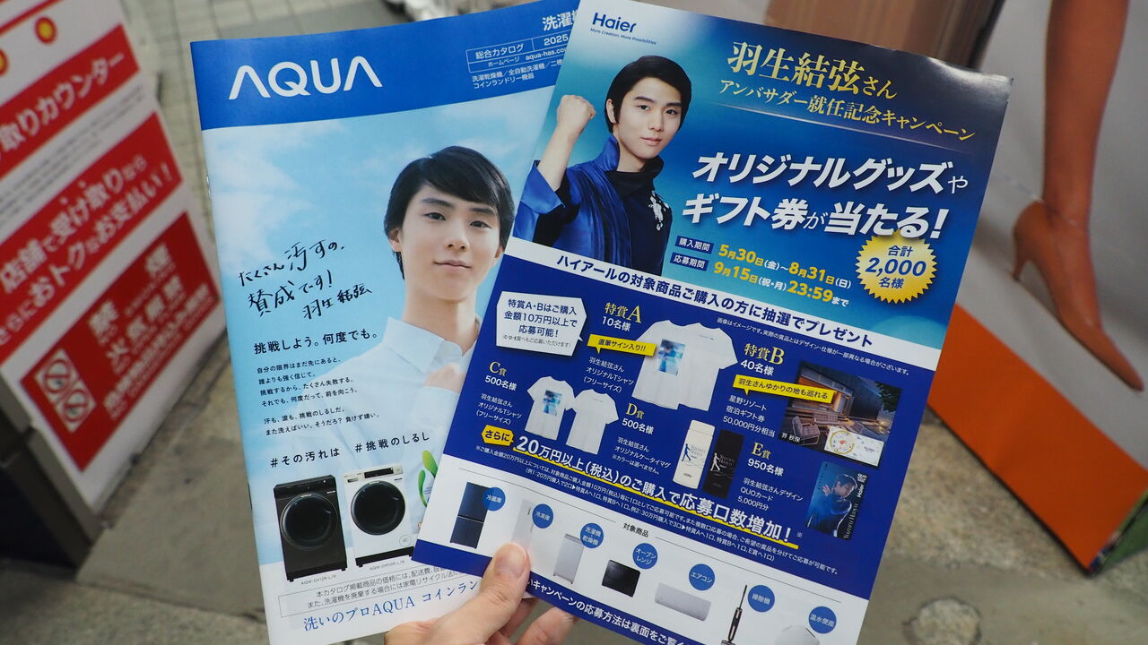 少し前に拝見したときより広告のバリエーションもさらに豊富になっており、キャンペーンのお知らせなども盛んに告知されています。ハイアールさんからは製品購入者を対象にサイン入りTシャツなどが当たる豪華キャンペーン、そしてAQUAさんからは冷蔵庫購入で20000円をキャッシュバックしてくれるキャンペーンが、それぞれ熱烈に(冷え冷えのエアコンとか冷蔵庫とかだけど)アピールされております。僕もパンフレットやらリーフレットなどいただきまして、いよいよ本番の神殿詣でへと向かいます。