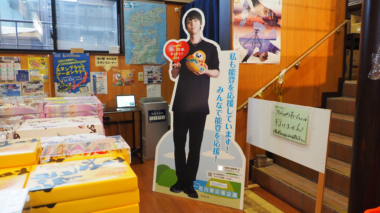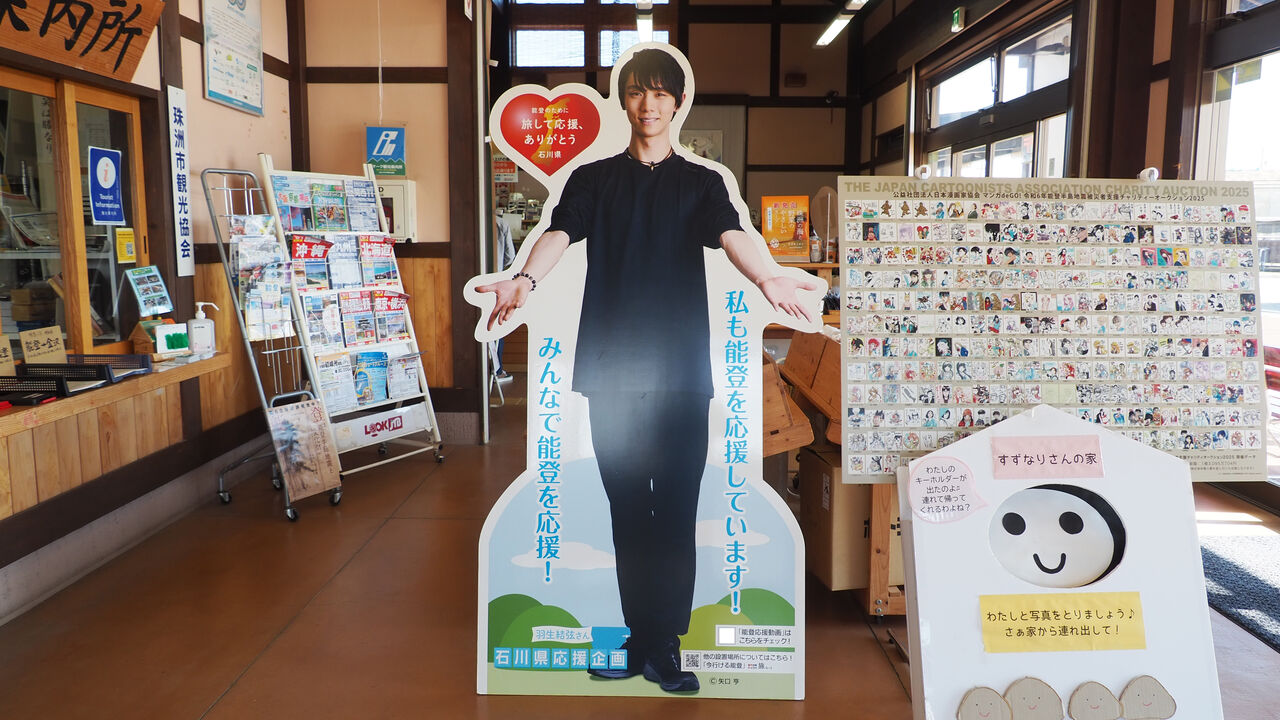 お昼過ぎに珠洲をあとにしまして、再びバスの旅へ。お次のパネルは鉄道駅もある穴水という町にあるとのこと。こちらでは駅隣接のショップに等身大パネルがあるほか、徒歩で巡れる近隣の施設にポスターの展示もありましたので、散策を兼ねて町内を巡っていきます。