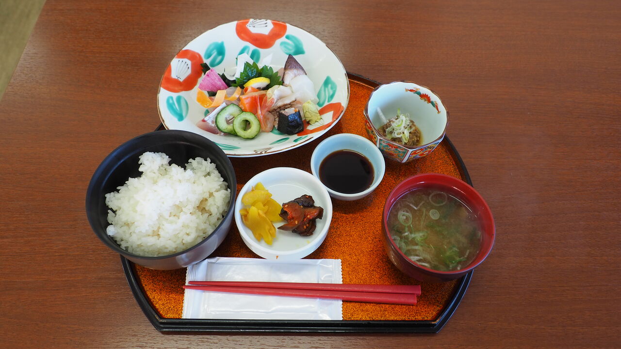 道の駅で名産品など物色しつつ、まずは腹ごしらえということで「食べて応援」としゃれこむ僕。道の駅に併設するように食堂が設けられておりましたので、ここで食べないわけにはまいりません。地元の人からも人気の食堂のようでひっきりなしに人が訪れる繁盛ぶり。僕は人気と思しきお刺身の定食をいただくことにします。
